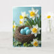 Designed with a soft spring still-life, the front shows a rustic bird’s nest made of thin brown twigs, gently cupping three smooth eggs in a calm robin-egg blue. Around the nest, clusters of white flowers with golden-yellow centers lean in close, like friends gathering shoulder to shoulder 🌷. Some blooms and leaves appear crisp and detailed, while others fade into a gentle blur, giving the scene a quiet, intimate closeness. The background is a pastel blue wash that looks like early morning light, keeping the mood light and airy. Green foliage threads through the arrangement in both sharp and softened patches, adding natural movement without crowding the nest. The greeting text sits near the top in a small, simple font, colored a warm golden yellow that echoes the flower centers 🐇. In the foreground, a few petals curve outward beside the twig weave, with the nearest flower’s yellow center shown in clear detail.