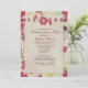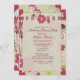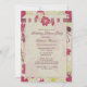 Fanciful flowers and birds in red and light green hues, create a cheerful backdrop for the see-through overlay which is threaded with a "ribbon" on top and grounded by a flower cluster. This beautiful invitation is suitable for any feminine celebration.
