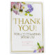 This gift bag is a wonderful way to thank special guests, family, or members of your wedding bridal party. Features gold and pink text on a white background with a gold offset squares border and a beautiful spring pastel bouquet of flowers including pink roses, white calla lilies & orchids, and light purple or lavender hydrangea. The text is fully customisable and reads: Thank You for Celebrating with Us, and has the couple's names.