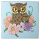Cute little brown owl sitting amongst pastel pink, peach and purple Spring flowers in a backdrop of light blue