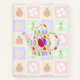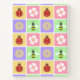 Pastel pink, yellow, purple, and green squares are adorned with ladybugs, dogwood blossoms, daisies, and honeybees and then bordered by tight white stitching to create a fun and sweet spring patch-like pattern. On the front a watering can silhouette decorated with a tri-colour tulip creates a cute mask for the pattern.