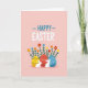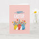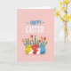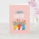 This design shows a blush-pink background with a large celebratory greeting set across the top in blue letters edged in white. Below the message, three egg-shaped decorations sit side by side, like a small shared display that feels sweet and companionable. One is sunny yellow with wavy lines and dotted accents, another is deep red with tiny white flower shapes, and the third is sky blue with white stripes and small blossoms. Two white bunny silhouettes 🐰 stand near the eggs, angled towards the centre as if they’re quietly keeping each other company. Behind them, a gathered spray of flowers rises on thin green stems, adding a gentle sense of closeness to the scene. The blooms mix yellow, orange, blue, and red, and a small 🌷 detail helps the garden feel lively without crowding the layout. The greeting stays at the upper edge while the eggs and bunnies fill the lower half, framed by the colourful flowers in the background.