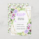 This fun and whimsical wedding rsvp enclosure card features watercolor purple flowers and foliage on a gold geometric frame. The text combines handwritten script and serif fonts for a stylish and modern look. This is perfect for a spring or summer rustic wedding.