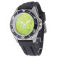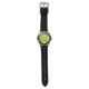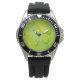 This Watch features an original abstract photograph by ZoeSPEAK of raindrops on a leaf. In the closeup photo, we see the texture and veins of the leaf magnified in the contours of the water droplets. The shiny yellow green leaf reflects the blue and yellow of the sky and sunlight.