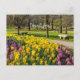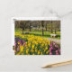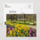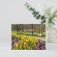 Thank you postcard featuring a photo of an early spring season morning walk along a garden full of pink and purple hyacinths and orange daffodils. The early morning sun is shining on them making them glow. A bench in the background is the perfect spot to sit, rest and enjoy the flowers.
