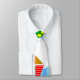This tie has a geometric design of kites flying in the clouds of a blue striped sky. It is very colorful and festive.