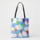 This tote bag has a geometric design of kites flying in the clouds of a blue striped sky. It is very colourful and festive.