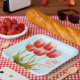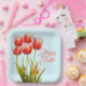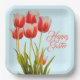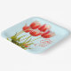 Spring paper plates with tulips. Pale blue colour plates with a bunch of red and white tulips with green leaves to decorate the centre. This big floral design will get you ready for warm weather and blooming flowers. Use for an Easter gathering, springtime birthday party, or for any reason. There is no wording to interrupt the pretty design. Plates come in round or square shapes, with other size options.