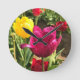 A beautiful variety of spring tulips at the Wooden Shoe Tulip Farm in Woodburn, Oregon. An up-close view of a pretty pink-purple tulip with other colourful tulips surrounding it. Photo taken April 2018.