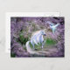 A delicately hued unicorn with lavender predominating in a similarly coloured blooming spring trees background and a fantasy bird celebration of a fantastical spring postcard