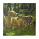 Two whitetail deer in the forest during spring time. A whitetail doe lies in the green grass next to a creek and licks her newborn fawn as sunlight streams through the trees to warm them. Realistic artwork created from an original oil painting by wildlife and equine artist Crista S. Forest.