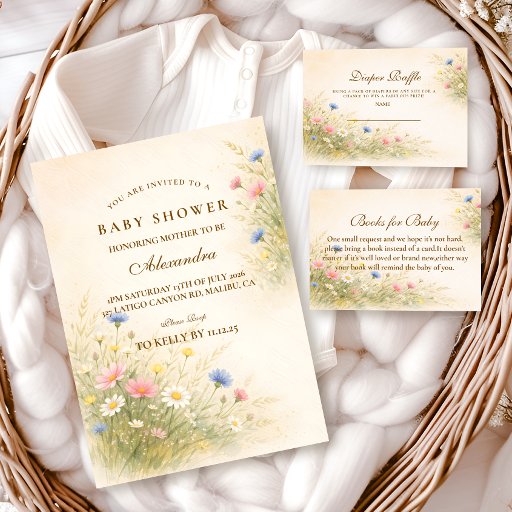 A soft watercolor meadow blooms across the bottom of this elegant design, featuring delicate daisies, blush cosmos, buttery yellow florals, and airy blue wildflowers. The warm ivory background and refined gold typography create a graceful balance between rustic charm and timeless sophistication. Inspired by sunlit fields and gentle summer breezes, this design feels romantic, fresh, and effortlessly classic. Perfect for a garden-inspired celebration with a refined, storybook touch.
