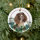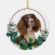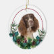On the front of this Holiday ornament is a beautiful portrait of a liver and white Springer Spaniel dog peeking out of a holly and evergreen bough. Red berries and pine cones decorate the holly and pine sprigs. The image is placed on a white circle within a thin red line circle. The back of the ornament has the same evergreen bough wreath and circle with your custom text in red.