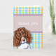 Make someone smile while expressing thanks with this original design by Off-Leash Art featuring a Springer Spaniel dog against a blue, green, orange and purple plaid background.