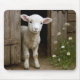 A young lamb stands at the entrance of a rustic wooden barn, exuding innocence and curiosity, while Queen Anne's Lace and daisies add a charming touch to the scene