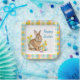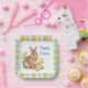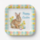 The design showcases an illustration of a wild rabbit, colorful Easter eggs, and cheerful daffodils, along with a "Happy Easter" message. The artwork is presented on a white background, bordered by a pastel pink, blue, and yellow spring plaid pattern, ideal for adding a celebratory element to your Easter event. For a coordinated look, explore the matching tear-away placemat within the Easter store category, specifically under party supplies.