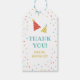 A fun, modern kids birthday party thank you favour tag featuring rainbow sprinkles and striped party hats.