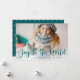 Create your holiday photo cards quickly and easily with this simple and elegant design. Card features your favourite horizontal or landscape orientated photo in full bleed, with "joy to the world" overlaid in spruce green script lettering. Personalise with your names and the year along the bottom. Cards reverse to a modern geometric tree pattern in matching green and white.