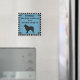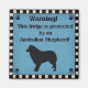 "Warning! This fridge is protected by an Australian Shepherd!" Featuring a silhouette of an australian shepherd on a blue background, surrounded by a black and white chequered border and black pawprints in each corner.