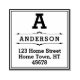 A traditional square personalised rubber stamp design featuring a double rule border with classic slab serif monogram initial, name and return address text.
