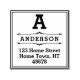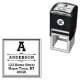 A traditional square personalised self-inking stamp design featuring a double rule border with classic slab serif monogram initial, name and return address text.