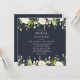 This beautiful, romantic white floral greenery watercolor square bridal shower invitation features a sumptuous greenery drop at the top comprised of a bountiful collection of eucalyptus greenery and white roses, hydrangeas, and other white flowers. A similar arrangement is placed at the bottom of the design, and elegant modern style invitation text personalises the design in the middle, with elegant white type on a modern navy blue texture. Copyright Elegant Invites, all rights reserved.