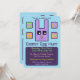 An invitation to an Easter egg hunt, with the location, date, time, and RSVP contact details. A purple bunny made from squares decorates the design, with colourful square eggs and a sky blue background. The back has a matching pattern of bunnies and eggs.