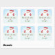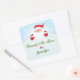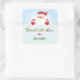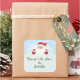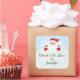 Custom personalised baking label stickers to add a bit of Holiday Cheer to your baked gifts this Season. A jolly Santa with red santa hat, gloves and suit, Peers over the 'baked with Love' Sign in Festive colours. all set against a blue and white snowflake background.