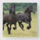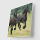 Pair of galloping friesian black horses in a field.