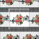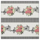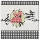This fabric design has a square dance couple dressed in red check outfits with music symbols behind them. The background colour is white with a black and white check border. This design is available in other layouts and sizes.