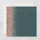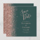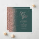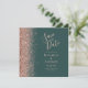 The left-hand edge of this elegant modern wedding save the date card features a rose gold faux glitter border. The customisable text combines rose pink handwriting, copperplate and italic fonts on a dark green background. The reverse side features a matching dark green and rose gold design.