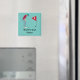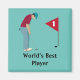 Square personalised golfer, wearing a cap, deep red shirt and blue pants, putting a golf ball into a hole magnet.