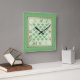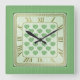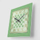 Digital art that resembles variegated green tiles was used to create a textured geometric pattern of offset rows and columns. A digital green frame and narrow green and white stripes enhance the duo-tone design. The square clock face has golden Roman numerals for each hour and lines to mark the seconds.