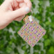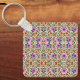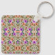Square keychain showcasing a vibrant floral pattern with green leaves, pink and purple flowers on a beige background. The design evokes a cheerful, vintage feel.