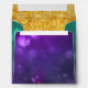 Square Envelopes designed to coordinate with a wide range of wedding invitations, party invites, bridal and baby showers, thank you notes and announcements. An hand drawn scroll swirl curly cue frame in gold metallic look glitter is on the front for you to write or print the address you're sending it to and on the back flap a similar coordinating shape for your preprinted return addresses. (NOTE: THIS IS A FLAT PRINTED INVITATION THERE IS NO ACTUAL GLITTER OR GOLD METALLIC INKS USED) A hand made bokeh twinkling lights sparkle shimmer image in peacock colours is the outside colour - purple, violet, blue, persian blue fading to green. Inside is a multi-colour and size gold glitter image. Graphically designed by Audrey Jeanne Roberts