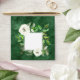 Square format envelope with return address preprinted. Forest green, hand painted watercolor background sets off the watercolor leaf foliage artwork inspired from forest greenery paired with seeded Eucalyptus leaf wreath and white wild roses. Art copyright, Audrey Jeanne Roberts all rights reserved.