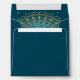 This deep teal and goldtone square envelope has a large central gold scroll circle medallion pattern on the inside with ornate swirled hearts detailing and gold stars and dots that lay over top of a dark teal blue background with another layer of fine bright aqua blue swirls and scrolls on it that match the Indian inspired wedding and engagement invitations shown below. You can select the colour of your choice for the outside of the envelope. Customise it with your own return address. If you want to change sizes, please email niteowlstudio@gmail.com to have one made up.
