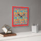 A pretty, square Wall Clock with an all-over pattern of red, orange, yellow flowers on a bright turquoise background and a Scarlet border, from a handpainted paper collage by Judy Adamson.