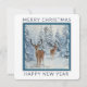 Unique Christmas card with a white winter forest scene with deer along with Merry Christmas & Happy New Year holiday design on a unique shaped square card! Edit your name on the back and the current year on the front.