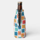 This bottle cooler has a geometric design of squares in tangerine, poppy, coral, and shades of teal scattered about with their outlines.