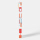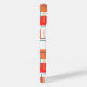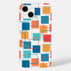 This phone case has a geometric design of squares in tangerine, poppy, coral, and shades of teal scattered about with their outlines.