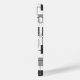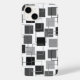 This phone case has a geometric design of squares in black and shades of grey scattered about with their outlines.