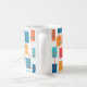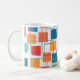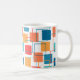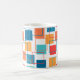 This mug has a geometric design of squares in tangerine, poppy, coral, and shades of teal scattered about with their outlines.