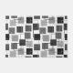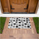 This doormat has a geometric design of squares in black and shades of grey scattered about with their outlines.