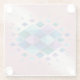 This metallic pink coaster features a digital art image of geometric squares in metallic blue, turquoise, teal and lavender. The squares are arranged in a circular pattern on a metallic pink gradient shifting in tone to highlight the geometric forms. The coaster is a metallic pink glass coaster. The glass coaster is dishwasher safe.