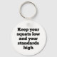 Squats Low Standards High Keychain with a modern and simple typography design saying "Keep your squats low and your standards high" in black. Add your own additional text and/or background colour to customise.