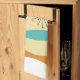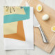 This funky mid century modern kitchen towel features squeezed and outstretched rectangle shapes In turquoise blue, cream, and orange. Starburst accents in pink, blue, gold, and black highlight the design. Fab kitchen decor!
