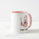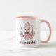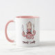 Pink squid chef cartoon with moustache holding knife and cooking fork. Custom text on both sides.