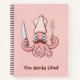 Pink squid chef cartoon with moustache holding knife and cooking fork. Custom background colour. Seamless pattern at back cover. Custom text.