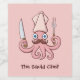 Pink squid chef cartoon with moustache holding knife and cooking fork. Custom background colour. Custom text.